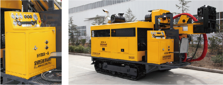 液压泵组、主阀、液压马达均选用国际品牌纯进口件动力头给进,提升采用油缸链条倍速结构、长给进行程;动力头离开孔口方式分翻转式或平移式;主轴回转采用双马达驱动闭式回路;2档机械变速箱辅以液压无级调速;桅杆用油缸起落,可滑移触地,可折叠;液压系统采用负载敏感控制;钢覆带自行行走;配有高位工作台和孔口工作台:配有液压支腿、上下导正装置:孔口配有液压夹持器,可选配数字化仪表监控系统。